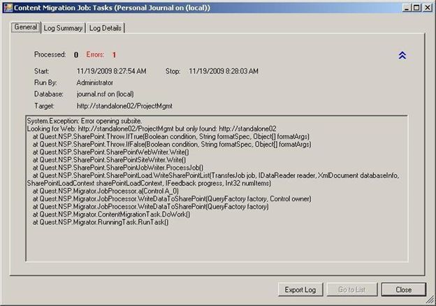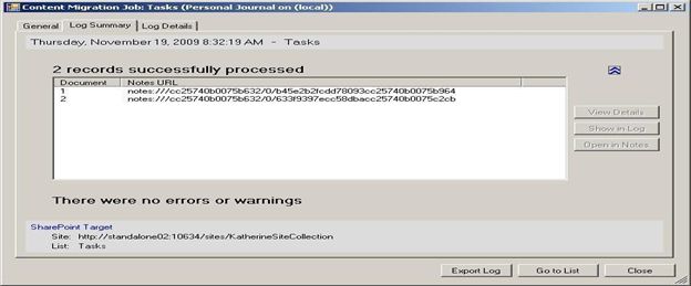 The Log Summary tab of the Event Log window displays the processed records of the migration job.