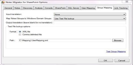 The Map Notes Groups to Domain Groups option will cause any Notes groups listed in the source database's Access Control List to be added to the target SharePoint site. The Notes group names are added to the Site Collection as external groups and are granted access to the target SharePoint list or library. Each group name must correspond to an actual Domain group.