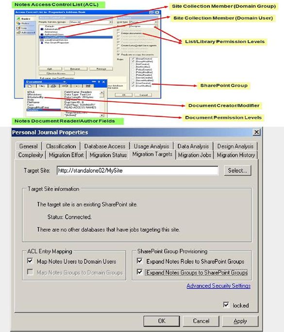 The Notes Migrator for SharePoint's security mapping options will map various access control properties of the source Notes database. An extensive set of options are available for mapping various access control properties of the Source Notes database and individual Notes documents to the equivalent security constructs in SharePoint.