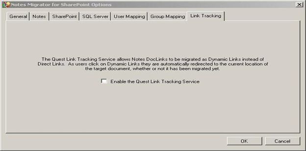 Link Tracking can be turned on and configured from this tab. If this is turned on, the document link tracking will be done by the Quest tool during a migration.