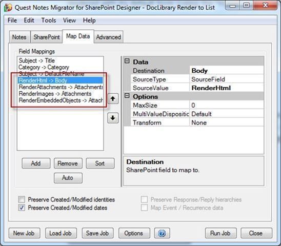 In most cases you will want to set the Option to HTML for mapping to SharePoint. Specifying a Form to render with is optional. If you don't specify one, each document will be rendered with its default form (using the “FORM” item in each individual Notes document).