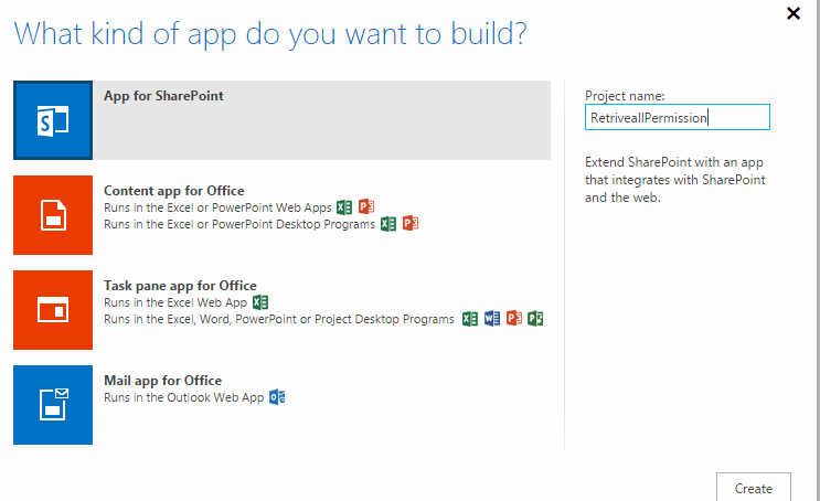 • Choose the App for SharePoint template, name the project Create Site and then choose the Create button