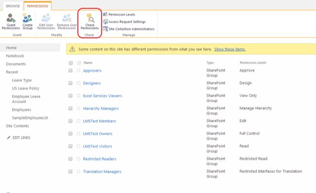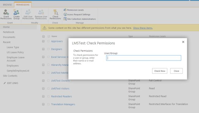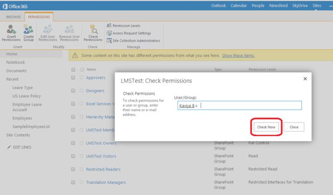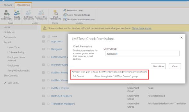 Step 5: After you click on “Check Permissions” in the Check section from the top ribbon bar, you will get the following pop-up as in the following: