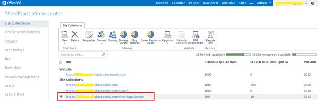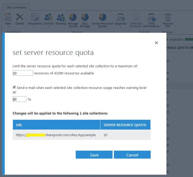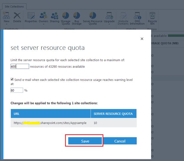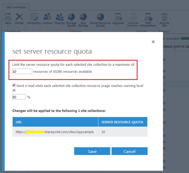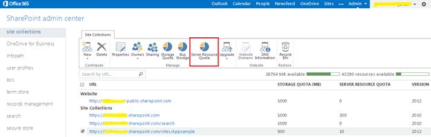 As a SharePoint Online service administrator, you can specify a server resource quota. You can also specify the warning level at which you are sent an email alert that the site collection approaches its resource limit. The purpose of this quota is to set a maximum percentage of server resources (such as CPU and RAM) that your site collection should use. The quota helps prevent one site collection from depleting server resources, that might adversely affect performance for all site collections.Procedure to increase the server resource QuotaStep 1: Open the “Microsoft Online Portal” (Admin Center) in your browser as in the following:URL: https://portal.microsoftonline.com/default.aspx Provide the username and password to login the portal, then you will be navigated to the online portal (Admin Center) as shown below.Step 2: Then click on the “Admin” dropdown on the portal. On the dropdown select the “SharePoint” as shown below:Step 3: When you click on the SharePoint, you will be navigated to the “SharePoint Admin center” as shown below:Step 4: Then select the check boxes next to the site collections whose server resource quotas you want to change.Step 5: On the site collection ribbon bar, select the Server Resource Quota as shown below:Step 6: Then you will get the "set server resource quota" dialog box to change the server resource as shown below:Step 7: In the dialog box enter a maximum number of resources on “Limit the server quota for each selected site collection to a maximum of” as in the following:Step 8: After completing the changes, click on the "Save" button in the dialog box to save the changes.