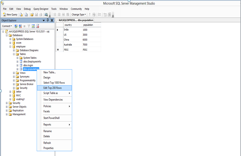 - Create fields in the table as country with data-type varchar and population with data-type int