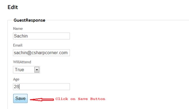 Step 2: Click on the Edit button, it will redirect you to the "Edit.cshtml" page. Fill in the required details and press the "Save" button as shown in the following image.