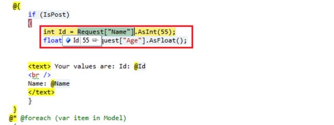 It reaches the "EditPost.cshtml" page and you can see that Id has the value 55 rather than “Sachin”.