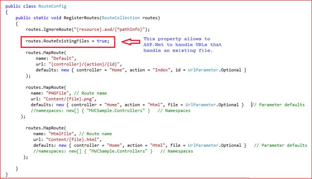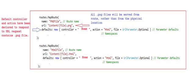 There are two entries in the RouteConfig.cs file that is pertinent to .png and .html files. So whenever the URL is for a .png or .html file, it will be served using route.