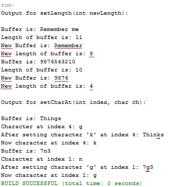 - System.out.println("Output for setCharAt(int index, char ch):");