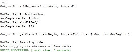 - System.out.println("Output for subSequence(int start, int end):");