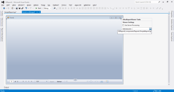 - Our Report part is done. Now, let us show this report on the Windows Forms form. To show an Infragistics report in the Windows Forms project, we will need another control provided by Infragistics named “UltraReportViewer”. Let us add the control to our main form and configure it to display the report.