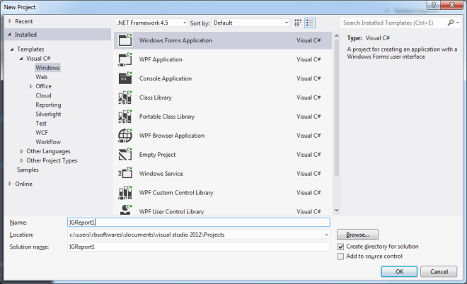 - Open Visual Studio and create a new Windows project. I will name the project IGReport1 (here IG stands for Infragistics).