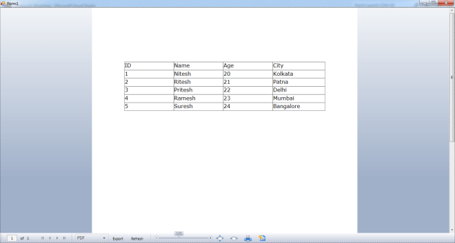 - You can also click on the “Preview” button present at the bottom of the report designer to view the final report to see how it looks like. The one we created looks as in the following: