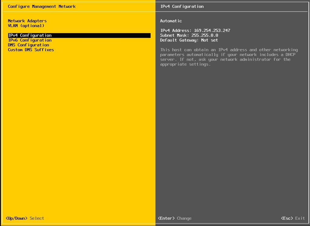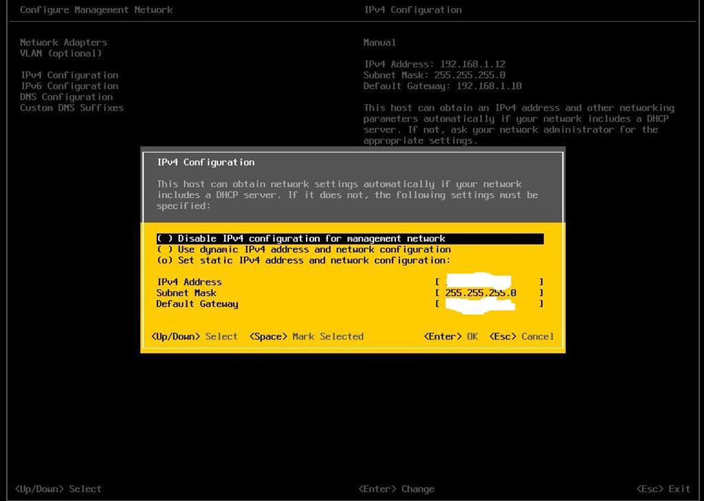 - You can make it to set the IP address as DHCP and also you can set it to static IP Address. Here I am setting it to use static IP address, select Static IP Address and enter the IP and hit enter and it will ask to restart management network click yes.