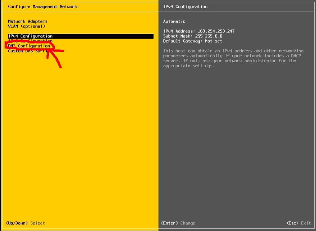 - Go to DNS configuration, enter hostname which you want to set to the server (host), and click ESC key to come out of the configuration page.