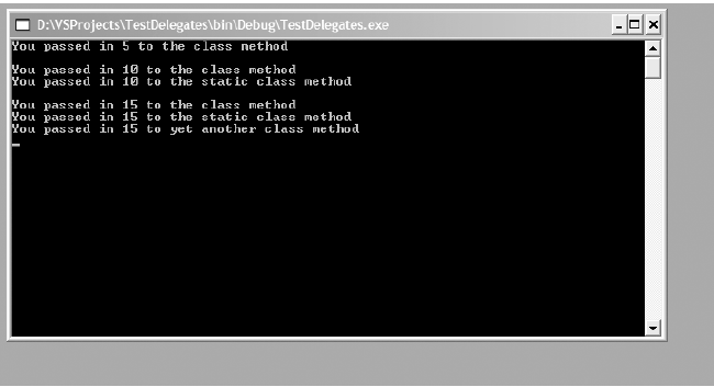 Figure 5-3. Output from our work with delegatesStepping back for a minute, you can see how delegates quite successfully fulfill the requirements of the publisher/subscriber model. Here we have the member function Main using an instance of the delegate to send messages to subscribing methods in the DelegateImplementorClass class. As long as the subscribing methods match the delegate signature, the delegate is happy to add those methods to its invocation list, and it promptly processes this list each time it is invoked with a call to d().If you step through this code with the debugger, you will notice that methods on the delegate's invocation list are synchronously called in the order that they are added to the invocation list. The syntax for adding a delegate to the invocation list may seem strange at first, because what we are really adding is something more akin to function pointers than, say, an integer. The magic behind this is the keyword delegate and the .NET infrastructure provided by the System.Delegate and System.Delegate.MulticastDelegate classes. The result is that the language compiler simplifies things by providing a keyword that developers use to plug into the delegate infrastructure.