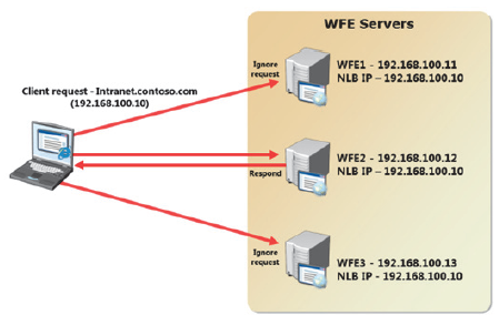 To point to the NLB address, when a client navigates to intranet.contoso.com in a web browser, the TCP/IP packets first reach the NLB component before NLB decides which server should handle the request. If a WFE server fails, NLB stops passing requests to that host and all requests are spread between the two remaining hosts until the failed server is brought online.