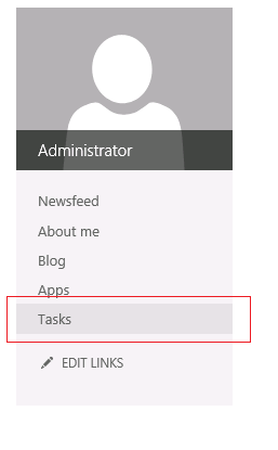 Now navigate to your Profile page (Person.aspx) by clicking "OneDrive" of your SharePoint site and you will see a "Tasks" link in the left navigation.