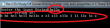 Output = h, he, hel, hell, hello, e, el, ell, ello, l, ll, llo, lo, o