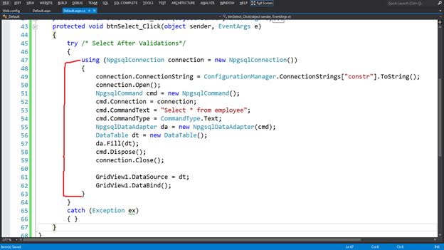 - using(NpgsqlConnection connection = new NpgsqlConnection()) {