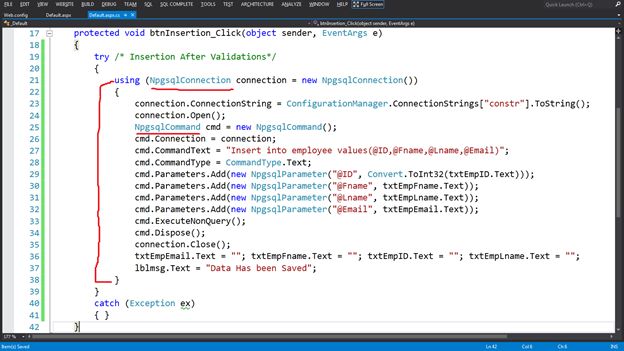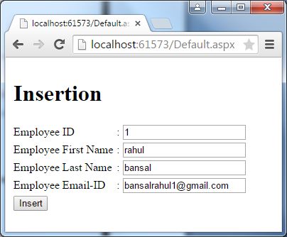 Inserting: To insert the data into the "Postgres" database, add the following controls on the default page named "Default.aspx" for doing the insert:
