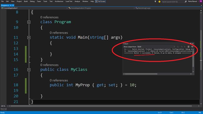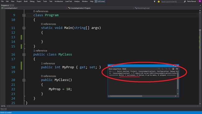 After creating the project, I will create a class named "MyClass" with a property named "MyProp" only with a "get" and "set" in "program.cs".