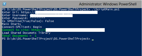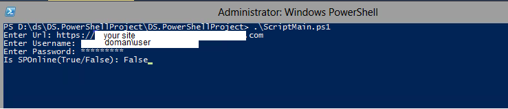 - Provide parameters: Site Url, User Name (domain\user), Password and IsSPOnline (True/False). Hit Enter.