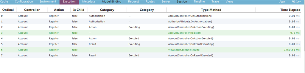 When in the Execution tab, you can get the MVC controller information and it's execution time.