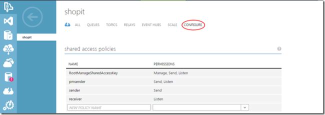 However, you can easily create a Namespace level Shared Access Policy through the portal by going to the Configure section under the Service Bus Namespace you created as shown below: