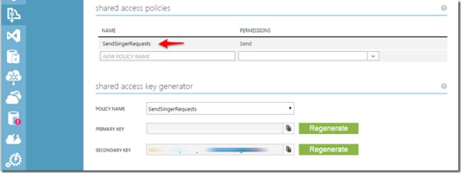In this case we are creating a Stored Policy with the name “SendSingerRequests” with the right to send on the topic which we can see if we navigate to the Topic under the Namespace for the Service Bus in the Azure portal: