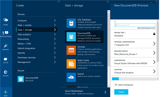 Click on New, then Data + Storage, click DocumentDB