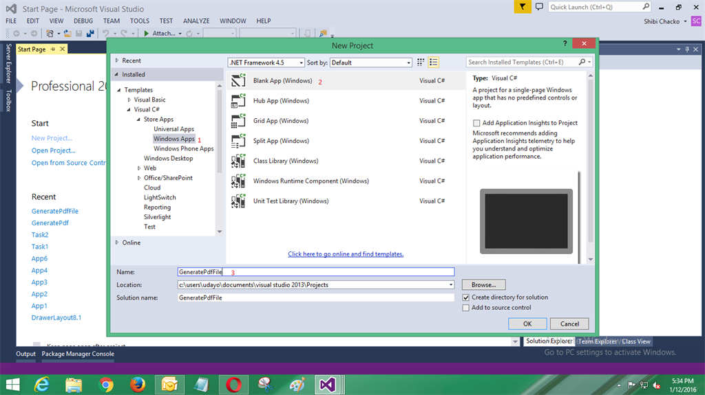 Step 1: Open Visual Studio 2013, click New Project, choose Windows Apps, select Blank App, and name as GeneratePdfFile. After that click OK.