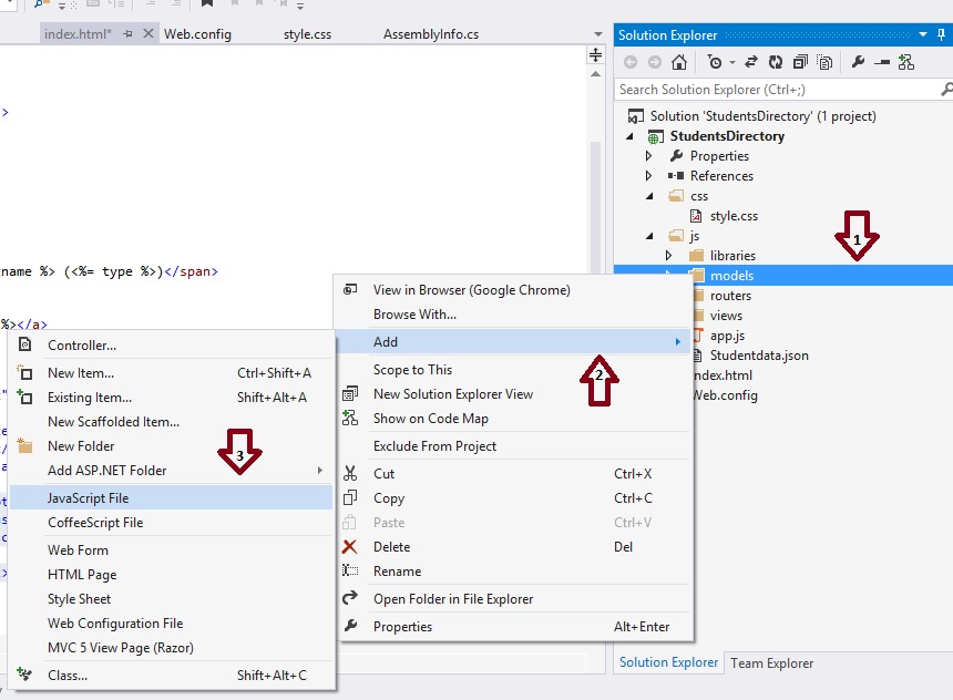 - Step 4 Now let's create a model. Create a new folder named models in the solution and add a JavaScript file
