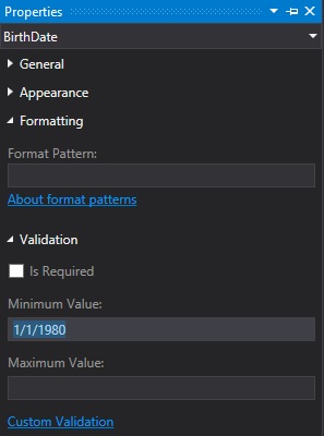 For BirthDate, set the minimum value to 1/1/1980 so that users can't enter dates before that.