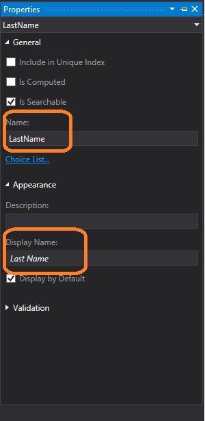 We will see various settings depending on the type of data we chose for the property. All properties have an “Appearance” section in the property window that allow you to specify the Display Name that will appear in field labels on screens in the application. By default, if you use Upper Camel Case (a.k.a Pascal case) for your entity property names then LightSwitch will put a space between the phrases. For instance, the Display Name for the “LastName” property will become “Last Name” automatically. So it's best practice to use this casing for your entity properties.