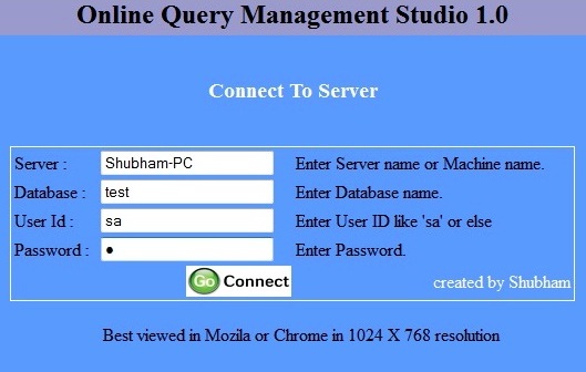 The basic idea behind making OQMS is that some time ago, I used a hosting panel where I created a table on a server but the server response was very slow and sometimes, the server was getting stuck and not responding. Then I made this web application and using this application, you need to use your SQL Server that is intalled on your machine and it does DDL and DML operations.