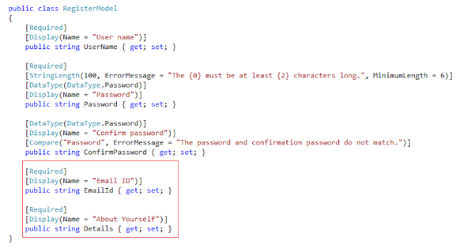 Open the Data Model "AccountModels.cs", and add the following things in "RegisterModel".