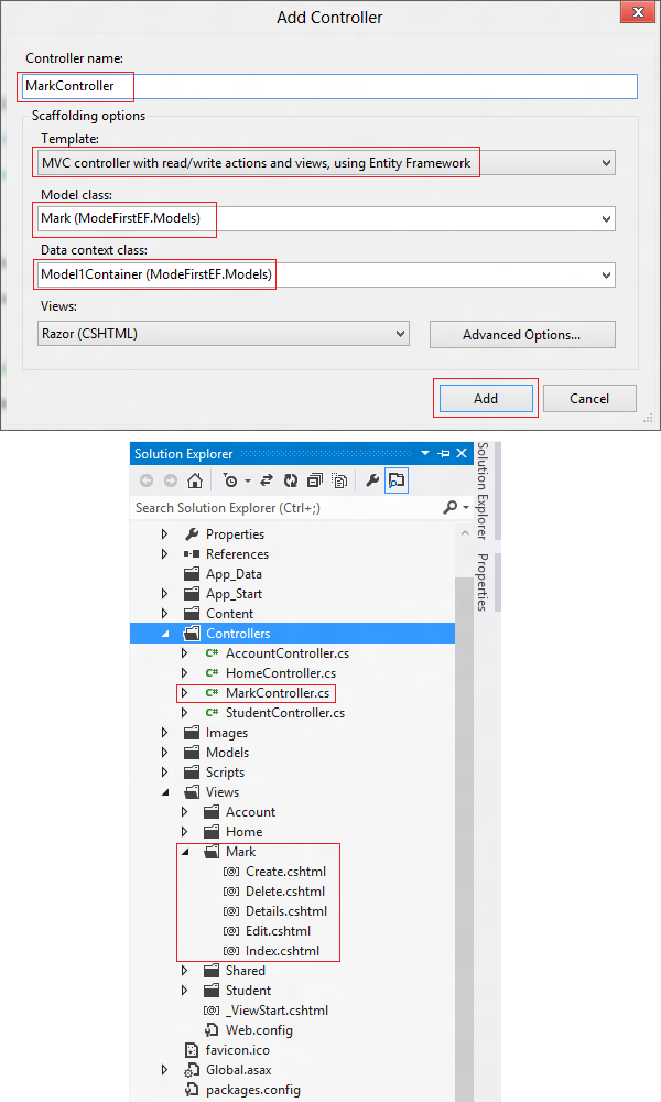 If you click on the Add button as above then the necessary controller will be added with its methods and also various views.