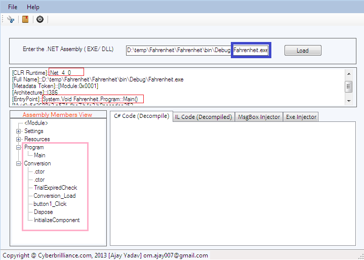Typically, we first read the assembly path and enumerate the contents residing in the assembly using an Enumerator. This software does not gather massive information held in any information. We usually are showing the disassembling mainly of methods.