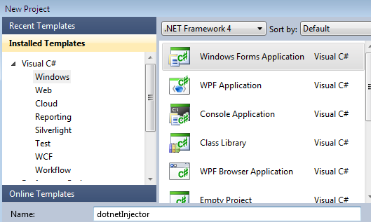 The construction of this software is not similar to a common Windows Forms application. We must deal with open source APIs such as the Mono project and Nuget package because the Visual Studio IDE alone is not enough to make this happen. This segment begins the process by providing the initial configurations. So, open the Visual Studio IDE and go to the new project type from the File menu and select the Windows Forms Application type from the project templates and assign the project name as gotnetInjector as in the following: