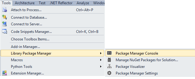Once the package is downloaded and installed as an add-in in the Visual Studio IDE, we have found its entry as Library Package Manager in the Tools menu as in the following:
