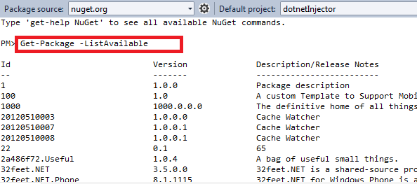 In order to list the available packages at the NuGet repository, issue the following commands: