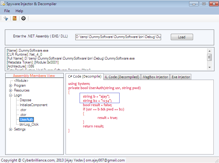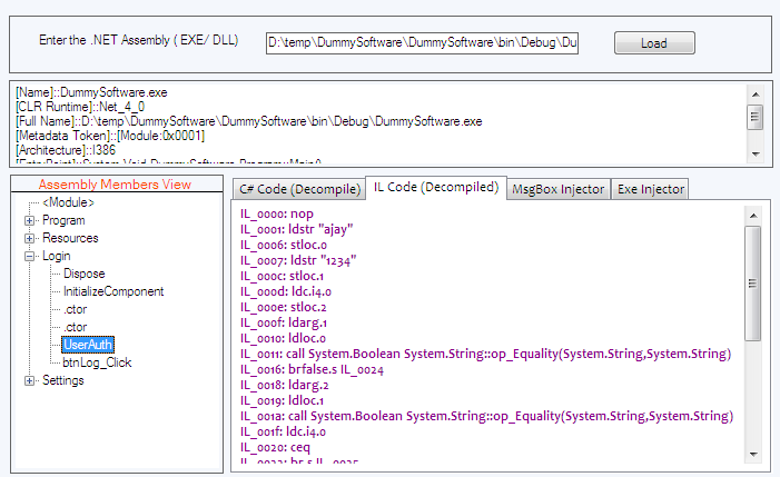 It is important to test both of the implementations that we have described earlier. We shall show the C# source generation process. In order to fulfill our goal, we need an exe or DLL file that has source code, we shall generate it using this software. The following DumySoftware.exe application is typically a login authentication mechanism and it restrains our way in the case of not entering a correct user name and password as in the following: