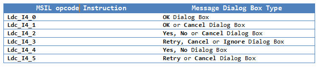 The message box is typically, found in 2 different flavors and accompany diverse buttons and are utilized in a specific scenario depending on the user requirements. So, it is obvious that each message box must have its CIL opcode representation to specific buttons, in the context of the CLR as in the following.