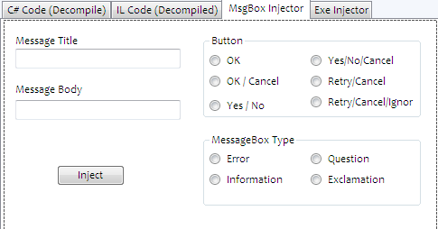 The following code in the InjectMsg() method that is called when the Inject button is clicked. Several methods from the external or internal classes, especially ILProcessor, MethodInfo and Instruction, are employed to integrate the external code of CLR opcode instructions into the existing code. Here, the user interface design for Message Box Injection typically contains a couple of TextBoxes and Radio Buttons. However, the information collected from the selection of those Radio Buttons and values entered into the TextBox, this software immediately generates the corresponding CLR opcode instruction and integrates such instructions, where the user wants to place it.