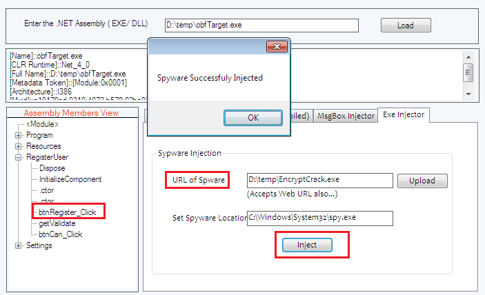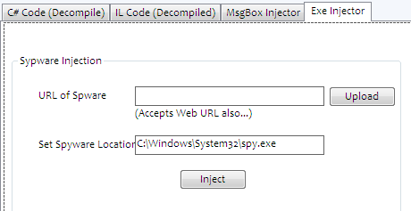 The functionality of External Message Box and spyware injection into a binary into the software is quite a long process and exhaustive. We shall need to play bizarre classes and methods in order to place the external MSIL code into an existing binary.