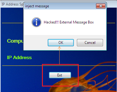 Hence, first upload this file into the software and here the EXIT button would be the entry point of execution for the external message box. So, fill in all the necessary data for showing the message box and hit the Inject button. You'll see that a message box will pop-up about the successful injection as in the following:
