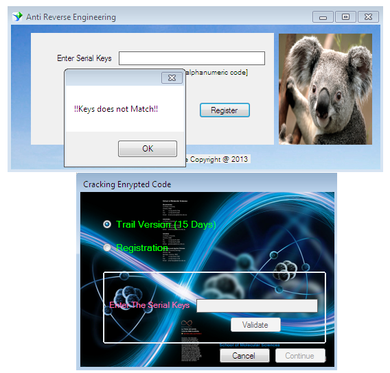 The victim file is typically an application that requires serial keys to proceed. Therefore, open the new version of this file and enter some value that you didn't know indeed. Obviously, the wrong key message is reflected as well as the inject spyware executable also activated and is displayed as in the following: