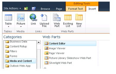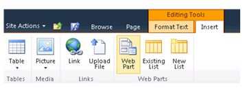 Step 3 : Click on the Insert tab in the ribbon interface and then click on Web Part button.