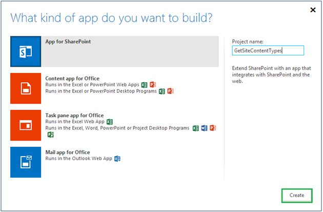 - Select App for SharePoint, enter the Project name and then click on Create.